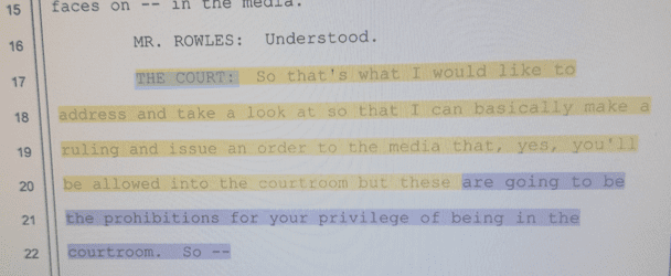 The order had many constitutional problems, but the most glaring one is that the the District Court invented a requirement that if any member of the media wants to cover a trial, it must have an “approved media request in the case file.” The court then issued an ultimatum to a reporter that the reporter could not remain in the courtroom unless he promised to keep certain information out of his article.